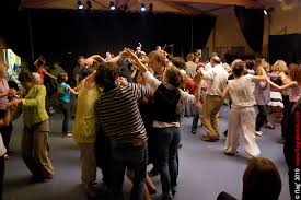Marie hélène Desmaris, chorégraphe danseuse, dirige le bal, et le public danse avec les danseurs du GRCA comme modèle d’apprentissage.
